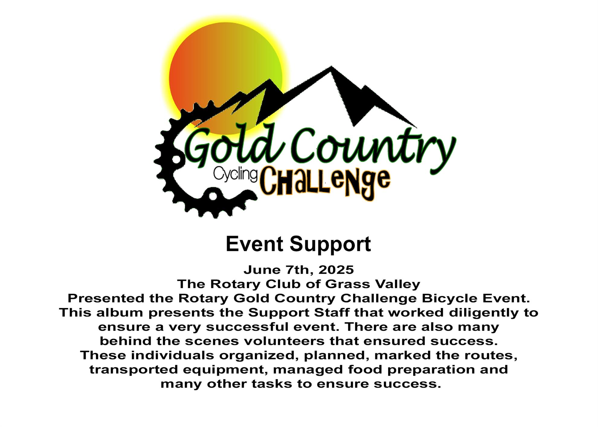 Gold Country Challenge - Support Team![]() The Rotary Gold Country Challenge was held on Saturday May 19th, 2018. This event was supported by a fabulous Support Team. We had support from the Nevada Country Sheriffs, California Highway Patrol, Grass Valley Police and the Nevada City Police. Our support team did an outstanding job making the event enjoyable for the riders. The Support Team manned the Coffee Stop, San Juan Rest Stop, Lunch Stop, Water Wagon Stop and the BBQ after the ride. Click on the following link to access the photo album: